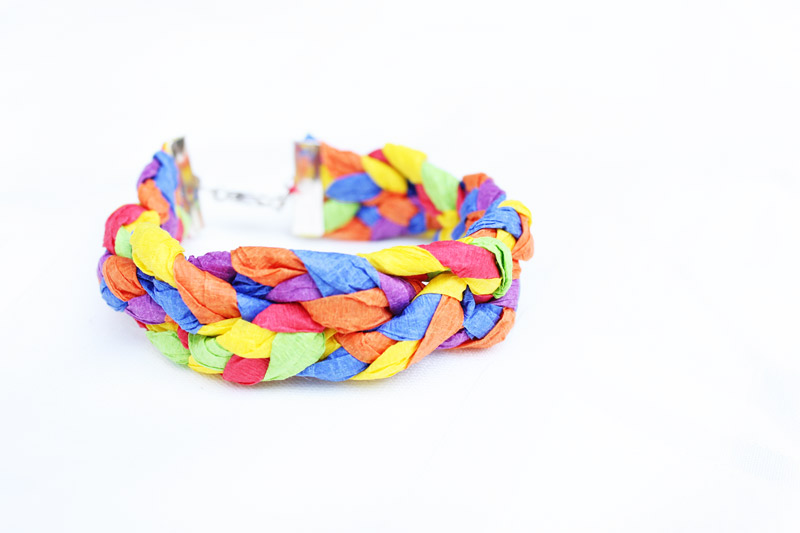 دوباره بافتن را آغاز کنید. سه رشته بافته شده را تا انتها ببافید و بعد با توجه به اندازه مچ دستتان، اضافه کاغذ کشیها را قیچی کنید.