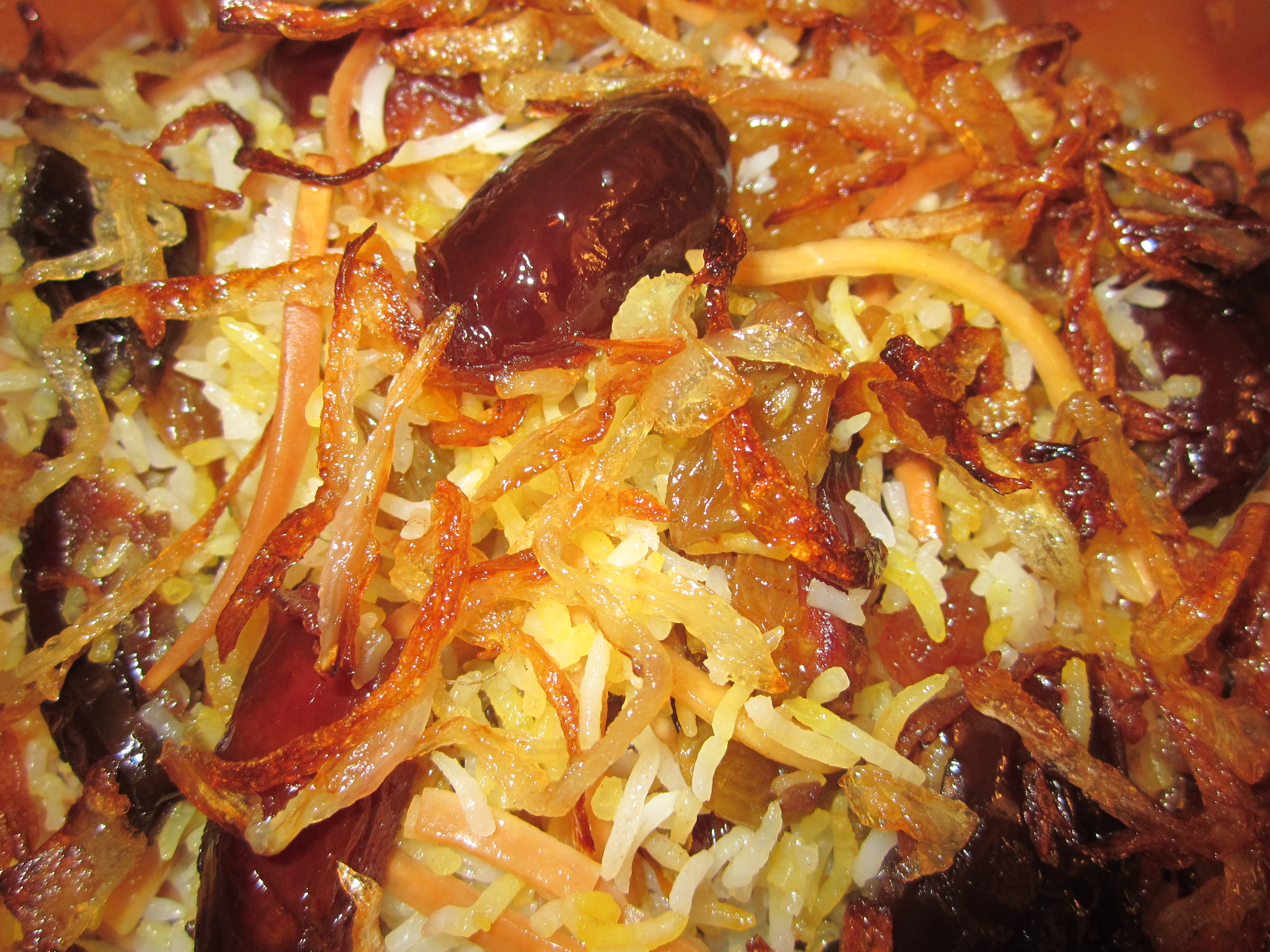 حالا بقیه روغن را با یک لیوان آب ته دیگ بریزید. نصف برنج را در دیگ ریخته گوشت و خرما و کشمش را لای آن بگذارید و با بقیه برنج روی آنرا بپوشانید.