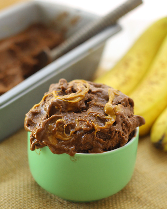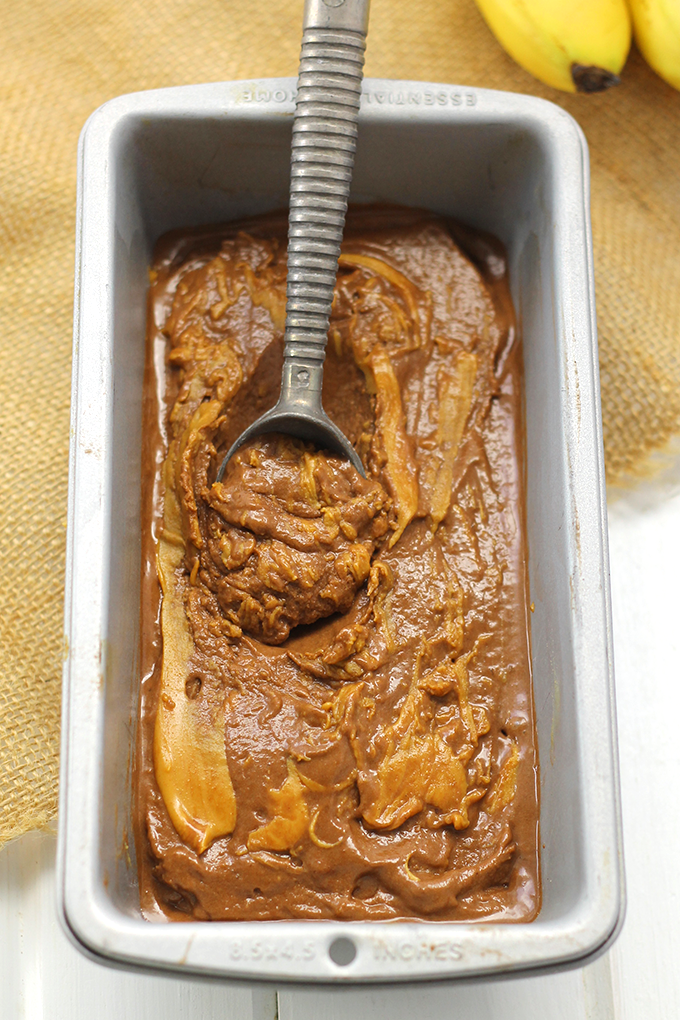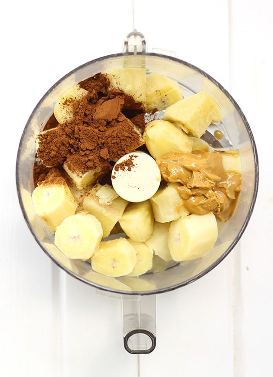 موز یخ زده را از فریزر بیرون بیاورید. پوست آن را به راحتی جدا کنید. قطعه قطعه کنید و همراه با پودر کاکائو و کره بادام زمینی در غذاساز یا مخلوط کن به خوبی با هم ترکیب کنید.