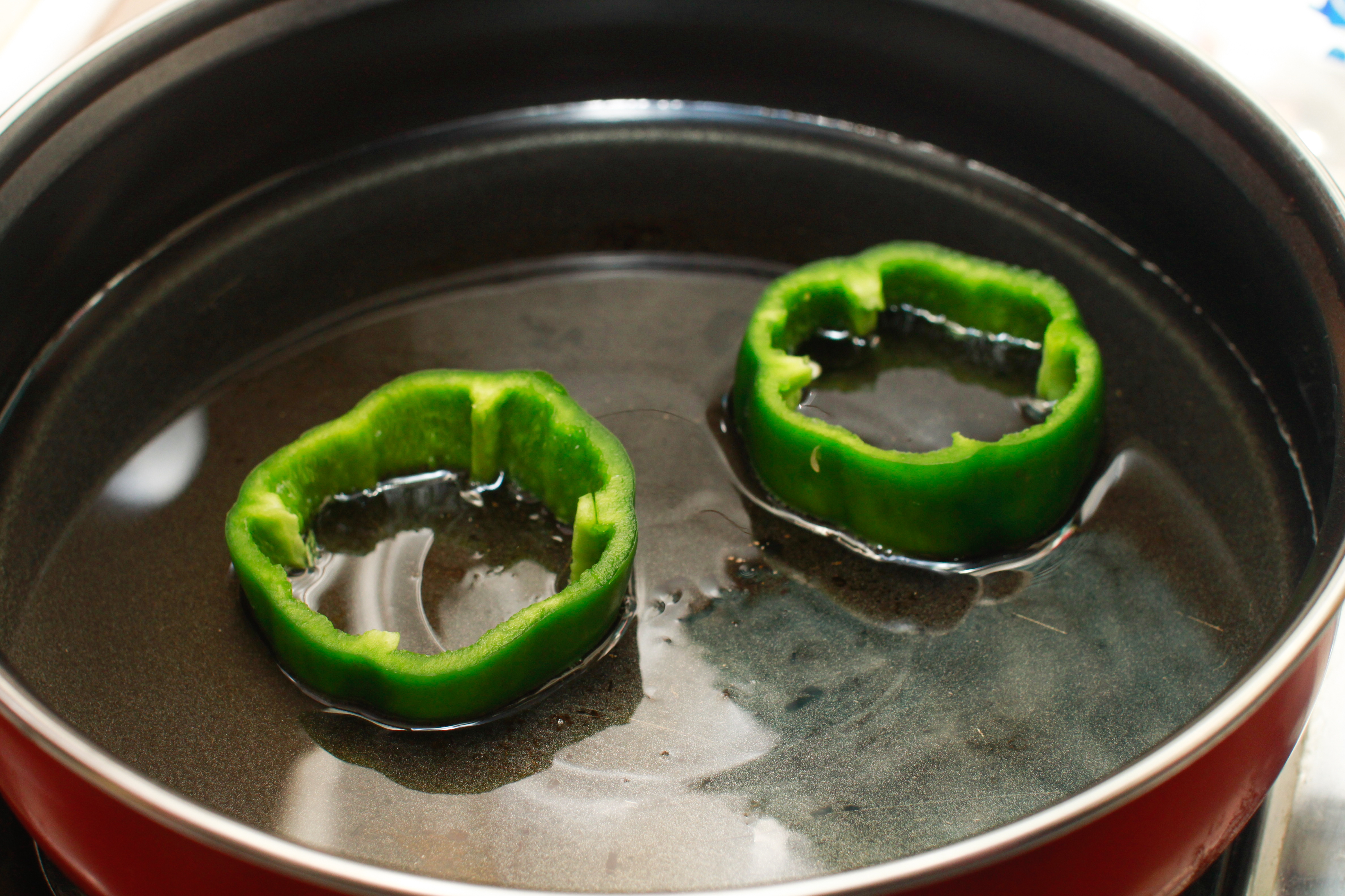 حلقههای فلفل دلمهای را برگردانید. حالا زمان اضافه کردن تخممرغ رسیده است.