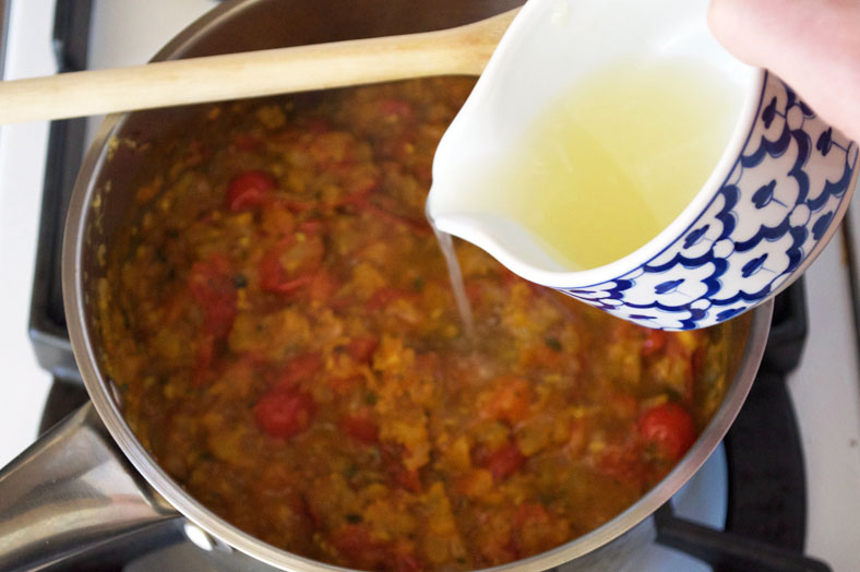 بعد از اینکه مقداری آب گوجهها گرفته شده، نمک و ادویهها را اضافه کنید.